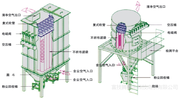 布袋集塵機正常工作時,在系統風機的作用下,含塵氣體吸入進氣總管,通過各進氣支管均勻地分配到各進氣室,然后涌入濾袋,大量粉塵被截留在濾袋表面上,而氣流則透過濾袋達到凈化。凈化后的氣流通過袋室沿管路通過風機進入煙囪而排入大氣。除塵機隨著濾袋織物表面附著粉塵的增厚,除塵機的阻力不斷上升,這就需要定時進行清灰,使阻力下降到一定的下限以下,除塵機才能正常運行。整個清灰過程主要通過高壓儲氣包、電磁閥、噴吹管及清灰控制機構的動作來完成的。首先控制系統自動順序打電磁閥,高壓空氣通過噴吹管反吹,使粘附在濾袋上的粉塵受沖抖而脫落下來進入灰斗。然后電磁閥關閉,對該系統清灰操作結束,濾袋恢復過濾狀態。控制系統再打開其它電磁閥,對別的濾袋實施清灰,所有濾袋經過清灰循環后,從而達到了清灰的目的,除塵機全面恢復過濾狀態,灰斗中的粉塵則由底部排灰機構收集。 外形結構圖