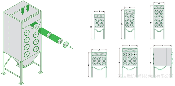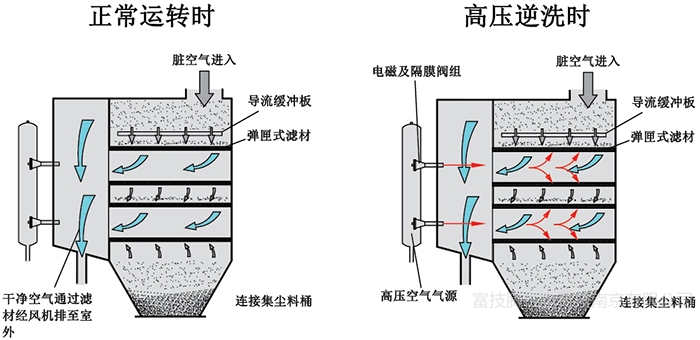 濾筒集塵機正常運行時,啟動風機,含塵空氣由頂部或前部入口進入集塵機,并通過濾筒過濾,粉塵則被捕集在濾筒外表面,清潔空氣則經過濾筒中心進入清潔空氣室,再經出口排出。濾筒清灰時,時序控制器將自動對濾筒進行清灰。這時,時序控制器將操縱電磁閥以打開空氣隔膜閥,高壓空氣通過儲氣筒直接沖入濾筒中心,把捕集在濾筒表面上的粉塵吹落,粉塵隨主氣流所趨,在重力作用下向下落入集塵斗中,再通過排灰機構落入指定收集容器。工作原理示意圖